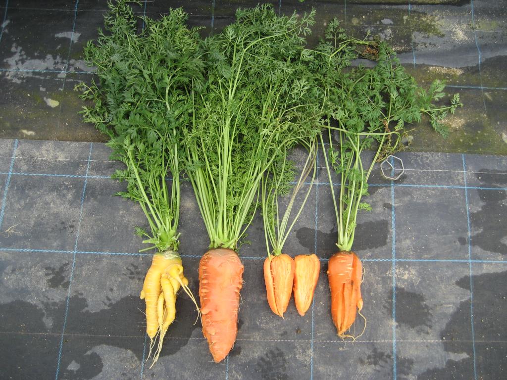 前回の大根の変形に続いて、今回は人参の変形について。人参も大根と同様に高温などの影響で変形したり短根になったりします。今年は遅くまで暑さが続いたため、九州では7~8月播種の人参の出来があまり良くないと聞きます。ただ、上の写真の左端の黄色の人参には別の原因があります!おわかりでしょうか?ネコブセンチュウです。センチュウの被害に会い生育が止まり別の根を出し、またセンチュウの被害に、と繰り返していくつも股が出来たと思われます。残りの3本が割れているのは、置き過ぎが原因ですが割れた中の芯から、また根が出ています。人参の生命力を感じますね。